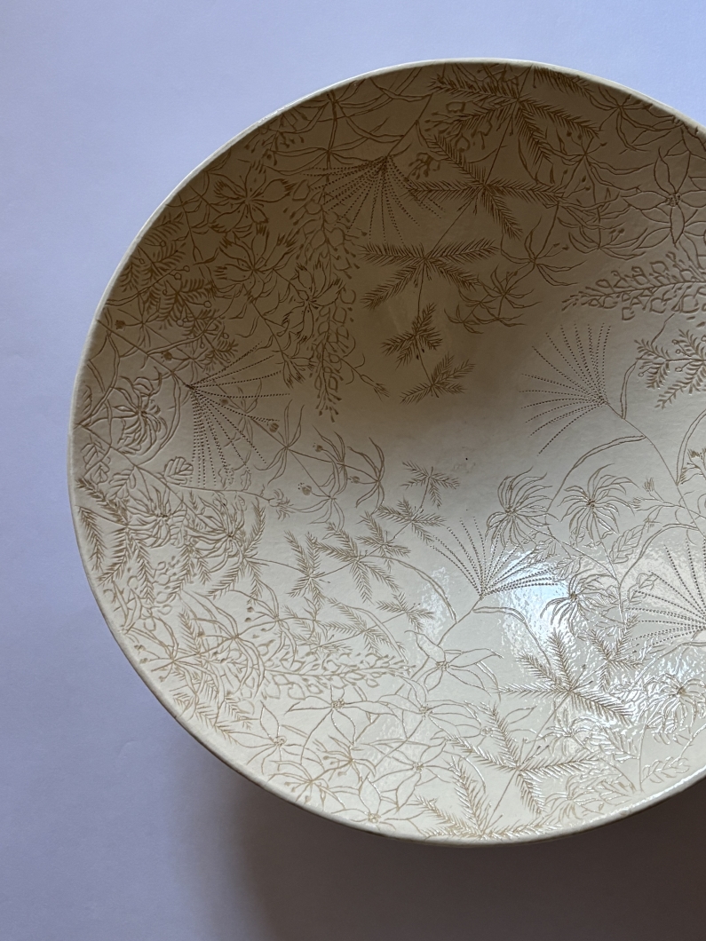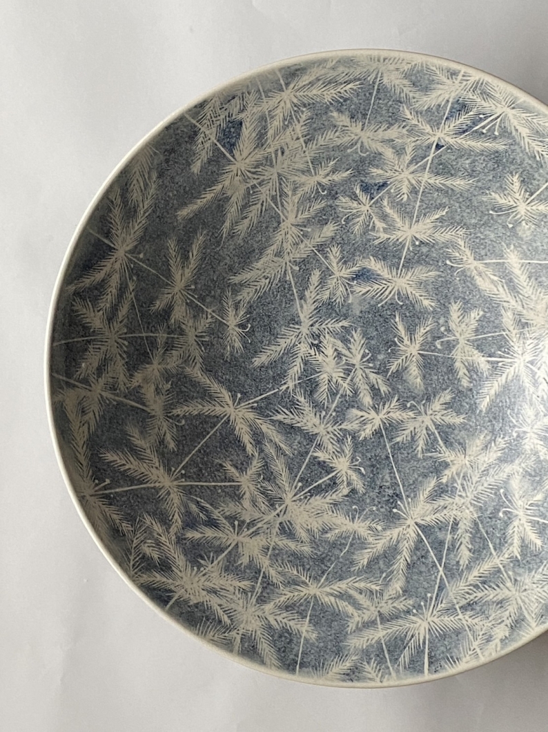 山本氏の作品に、土物に紅柄で文様を描いた銹絵(さびえ)がある。光琳から脈々と続いている琳派のモチーフをちりばめた作品は、たおやかな世界観だ。