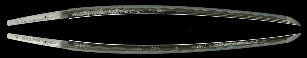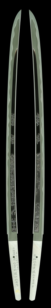 月山鍛冶のつくる刀は、直刃という刃文と綾杉肌という地鉄の文様を特徴とし、月山伝と呼ばれる。直刃は、焼き入れによって刀身に生じる真っ直ぐな文様。綾杉肌は、地鉄に波打つような木目文様が現れる様をいう。