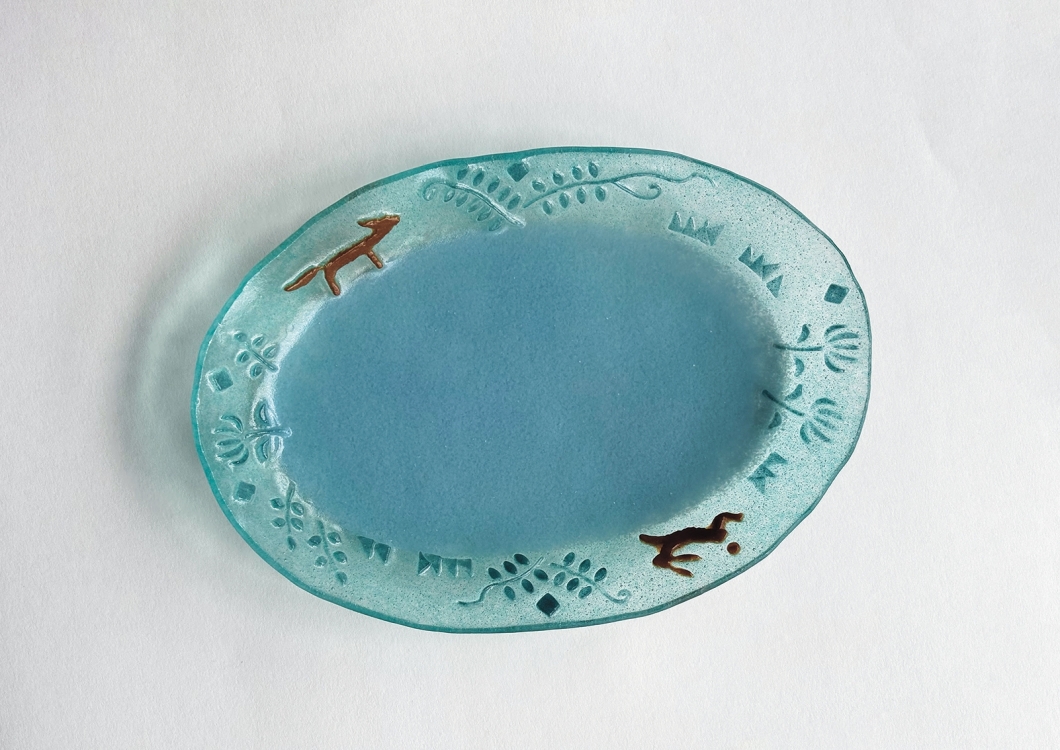 最近では器などを作る際、表面に凸凹をつける作り方をしている。これはいつも綺麗になり過ぎるガラスの表面に陶器のような手触りを持たせるため。粘土で原型を作った時の手跡を残すため、原型をシリコンゴムに置き換え、石膏で型を取り、そこにガラス粉を詰めて焼成する。今までのフュージングの技法とパート・ドヴェールの技法を合わせている。