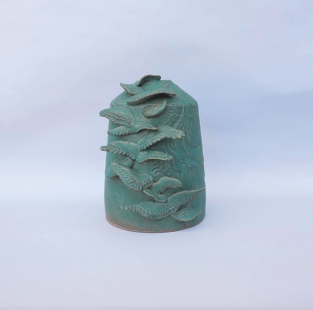 作品は成形を得意としており、彫りを装飾としてほどこす。自然をモチーフとしたものが多く、それは工房をとりかこむ自然の風景に由来する。鳥、山、川。外を見たらインスピレーションがわく。目指すのは、自分の作品が何百年後かに、面白いものを作っていた人がその時代にいたんだなと思われること。いつも窯出しの作品初お目見えの時が一番楽しみと笑う。