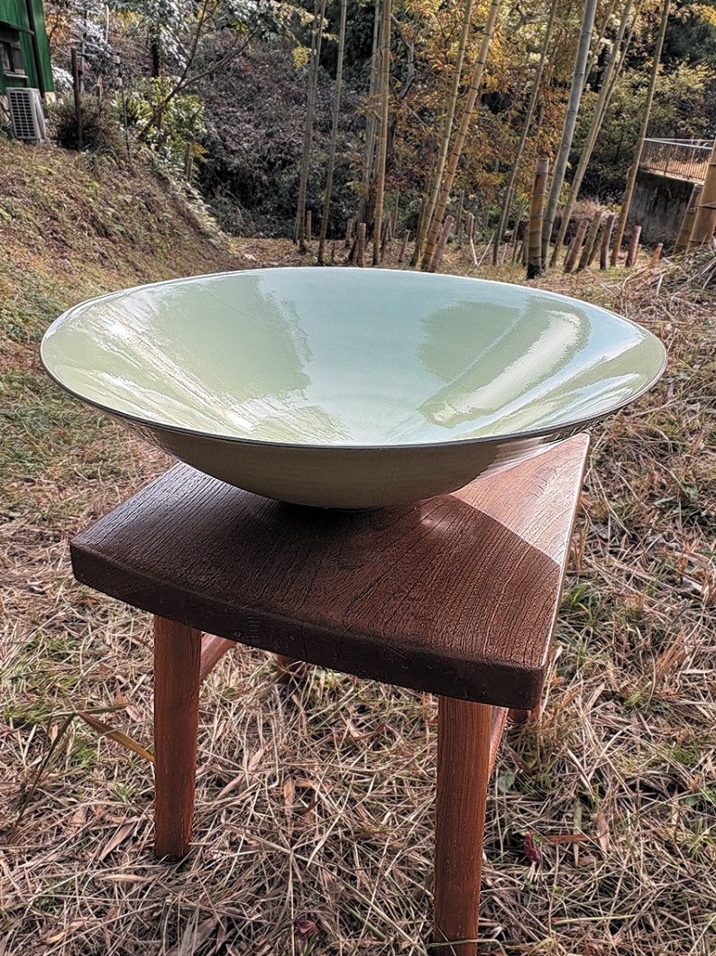 ずっと土もので青瓷(せいじ)を作ってきた。赤土から鉄分を引き出し、釉薬のブルーの鮮やかさを引き立てる。くすり掛けは非常に大事な工程で、釉薬の厚みが色の深みにつながる。薄すぎると青が出ず、厚すぎると流れる。最も際どい作業だ。